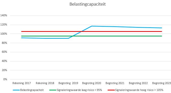 Belastingcapaciteit: dit kengetal geeft inzicht in de mate waarin de gemeente een financiƫle tegenvaller kan opvangen of in hoeverre er ruimte is voor nieuw beleid. Een laag percentage betekent dat de gemeente meer inkomsten uit belastingen kan verwerven.